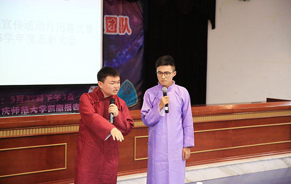 闭幕式上,广播台的同学为在场师生奉献了诗朗诵《祖国颂》、相声《我的大学》。他们精彩的表演令现场掌声不断。
