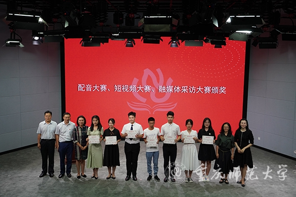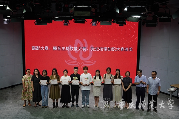 颁奖环节中,获奖学生代表进行节目展示或分享获奖感言。文学院2021级王潞嘉同学模拟主持展示《观物品文》,声音铿锵有力、思维清晰、台风沉稳,让人眼前一亮。新闻与传媒学院2020级郭哲彤、叶丽芳,2021级硕士研究生周桂宇,地理与旅游学院2020级黄代强,共同带来《魂断蓝桥》片段配音展示;他们将人物角色扮演得惟妙惟肖,展现出了重师学子多才多艺、自信活力的风采。马克思主义学院2019级吴芷馨同学分享作品《祖国在我心中》的拍摄构思,用自己的作品展现了时代的光彩。新闻与传媒学院2020级吴睿以信封为载体,将校徽作为封口,印上校风、学风和重师精神,添加了泛月桥、图书馆和东大门剪影以及荷花、银杏等元素,设计了本科新生录取通知书,其简洁大气,充满重师“韵味”。体育与健康科学学院2018级易小琅构思的短视频《文武双全体育人,神采飞扬筑青春》,以个人大学四年的收获与成长为主线,表达出校园的优美环境和所蕴含的体育底蕴,打破人们对体育生的刻板印象,展现出重师体育人的朝气和一代又一代的传承。