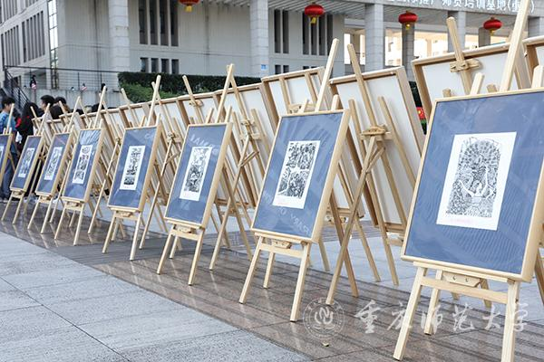 10月18日下午,由四川美术学院主办的“十九大主题木刻版画巡展”走进我校,在大学城校区图书馆广场开展。