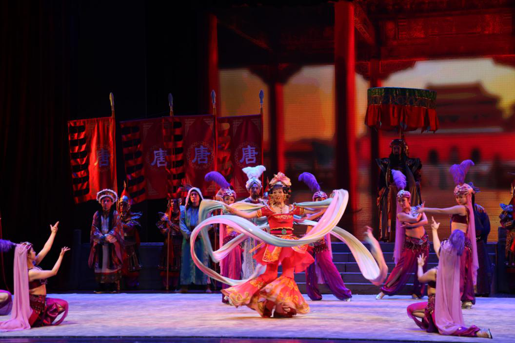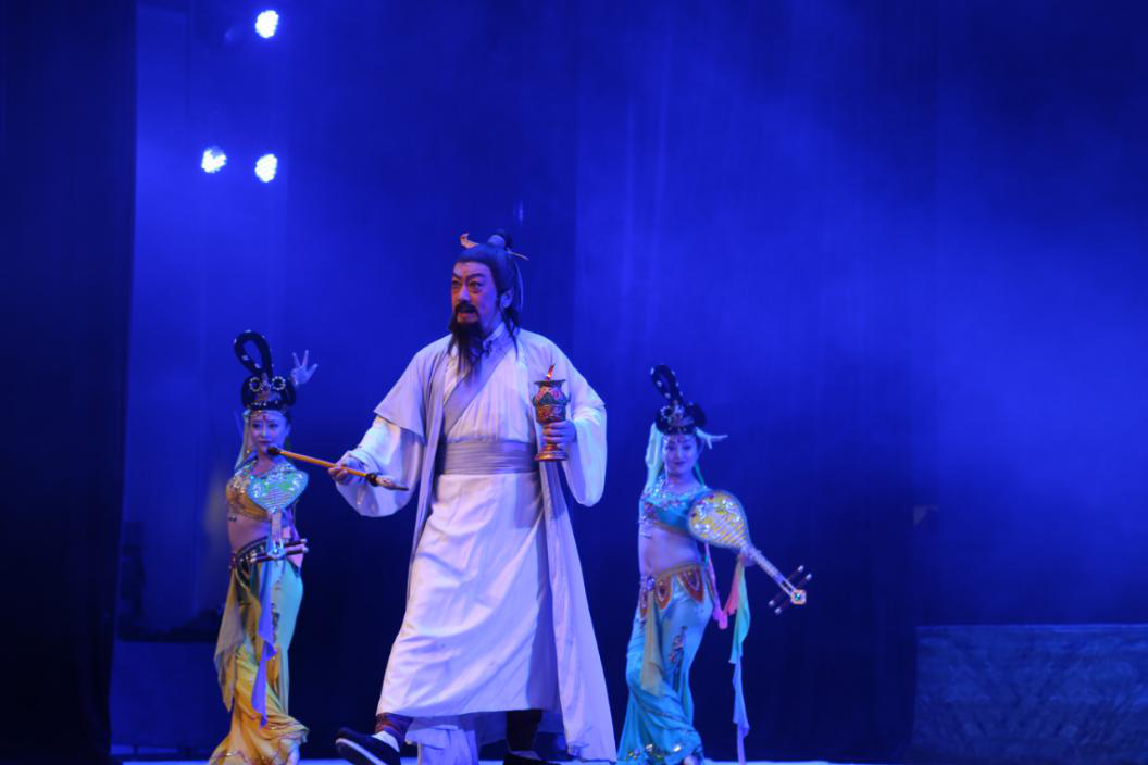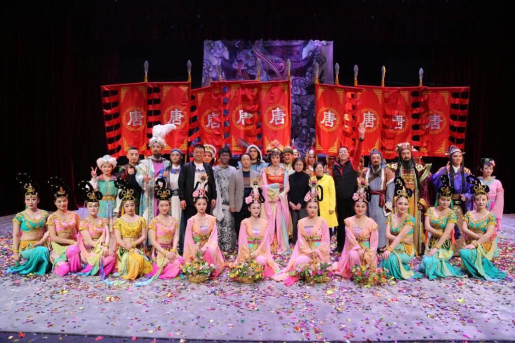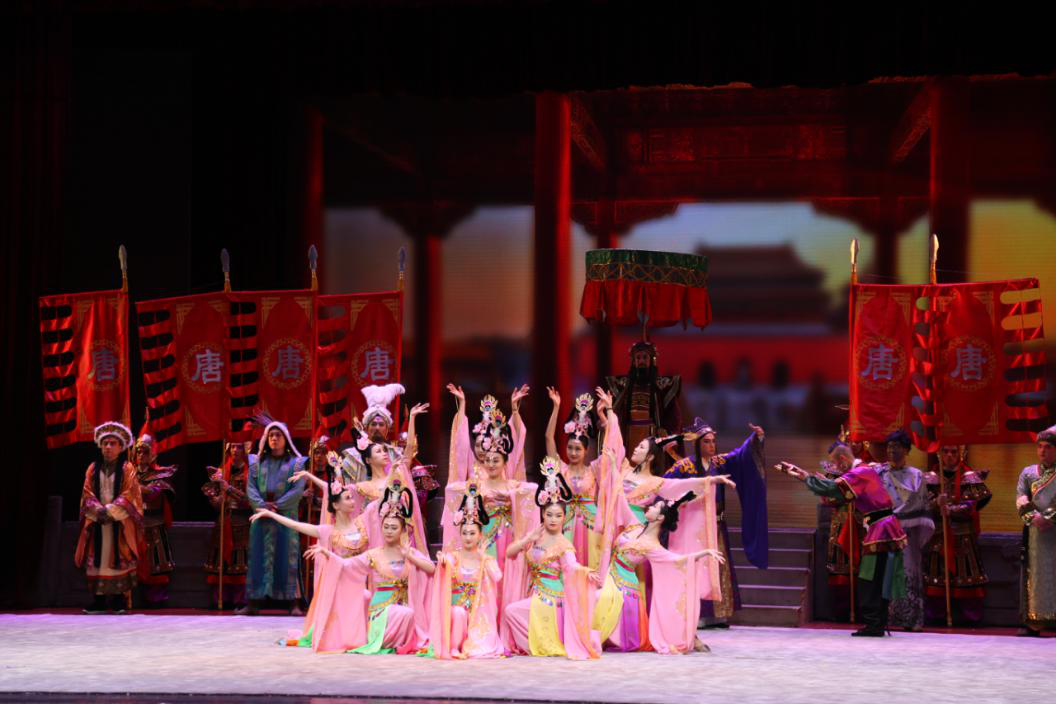 随着悠远的驼铃声,戏剧拉开了序幕,灯光渐渐亮起,英娘与神笔张登台亮相。雄浑的西部音乐响起,梦幻的灯光在舞台上交织,带领观众仿佛置身于千年前的大唐。“恰似神女从天降,舞姿绝伦压群芳”,身着绿色衣服,手捧莲花的表演人员簇拥着英娘,神笔张根据英娘优美的舞姿画出了“怀抱琵琶伎乐天”壁画。后来为躲避欺凌,英娘痛别了父亲,随伊努斯逃亡波斯,并将灿烂的华夏文明带到了西域,同时也从别致的波斯琵琶舞中获取了创作灵感。当英娘随遣唐使踏上归乡之路,市令再次从中阻拦,在敦煌交易盛会上,大堂使节与二十七国来宾欢聚一堂,英娘借力陈强盗罪状后,节度使下令将市令斩首,剪除了丝路上的匪患。随后,英娘舞的一曲“反弹琵琶”,更是将情节推向了高潮,无数“飞天”刹时升腾翱翔。极富美感的表演和优美的京剧唱段赢得了全场观众的赞扬,观众席上不时传来一阵阵掌声和叫好声。