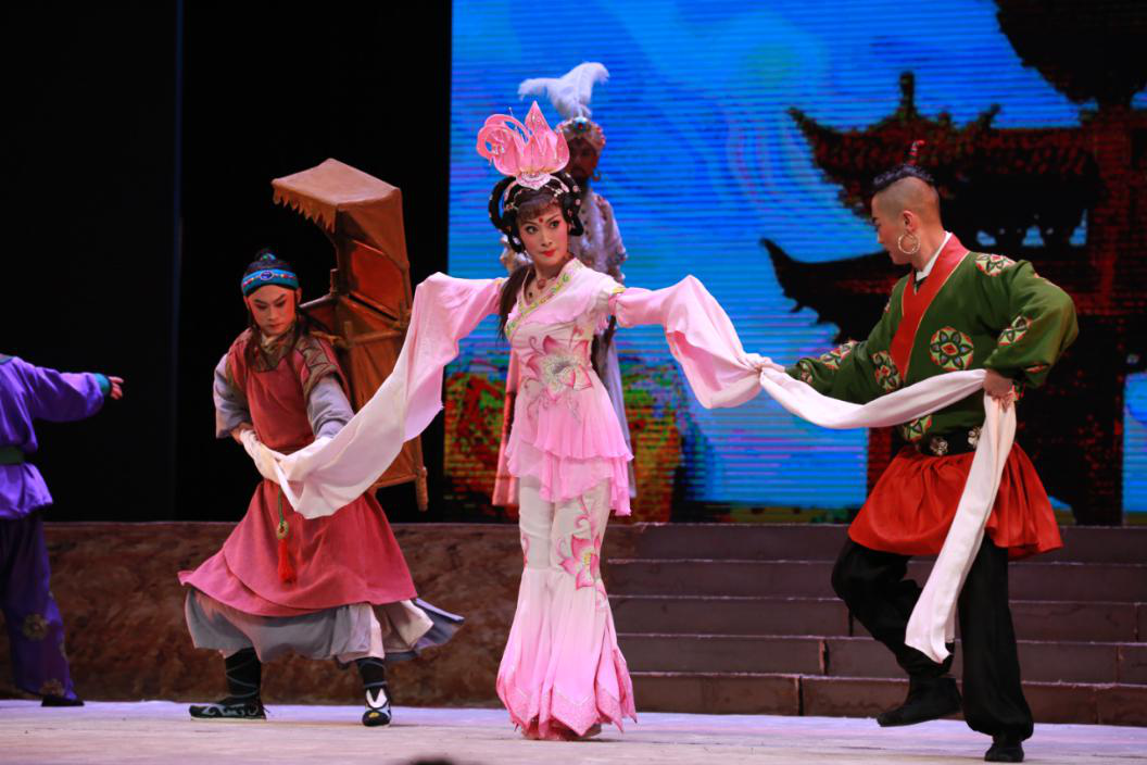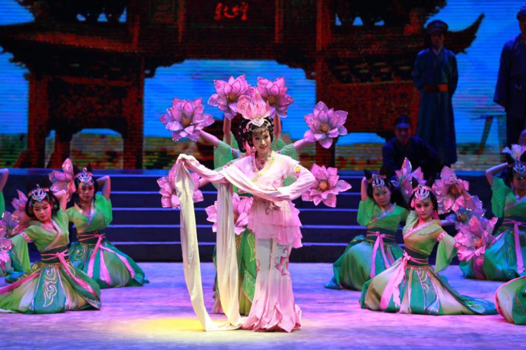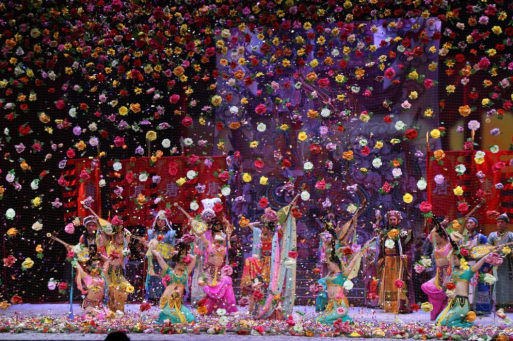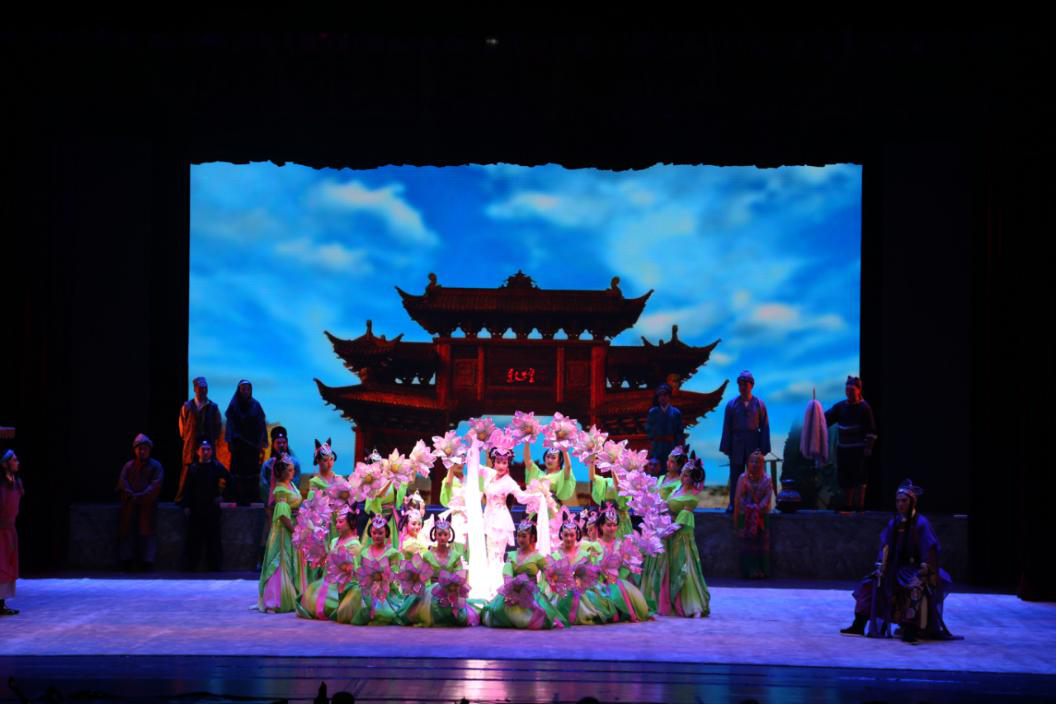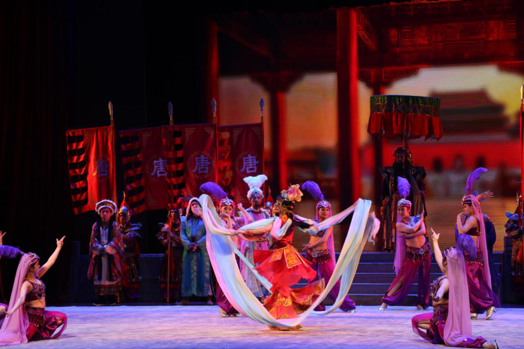 随着悠远的驼铃声,戏剧拉开了序幕,灯光渐渐亮起,英娘与神笔张登台亮相。雄浑的西部音乐响起,梦幻的灯光在舞台上交织,带领观众仿佛置身于千年前的大唐。“恰似神女从天降,舞姿绝伦压群芳”,身着绿色衣服,手捧莲花的表演人员簇拥着英娘,神笔张根据英娘优美的舞姿画出了“怀抱琵琶伎乐天”壁画。后来为躲避欺凌,英娘痛别了父亲,随伊努斯逃亡波斯,并将灿烂的华夏文明带到了西域,同时也从别致的波斯琵琶舞中获取了创作灵感。当英娘随遣唐使踏上归乡之路,市令再次从中阻拦,在敦煌交易盛会上,大堂使节与二十七国来宾欢聚一堂,英娘借力陈强盗罪状后,节度使下令将市令斩首,剪除了丝路上的匪患。随后,英娘舞的一曲“反弹琵琶”,更是将情节推向了高潮,无数“飞天”刹时升腾翱翔。极富美感的表演和优美的京剧唱段赢得了全场观众的赞扬,观众席上不时传来一阵阵掌声和叫好声。